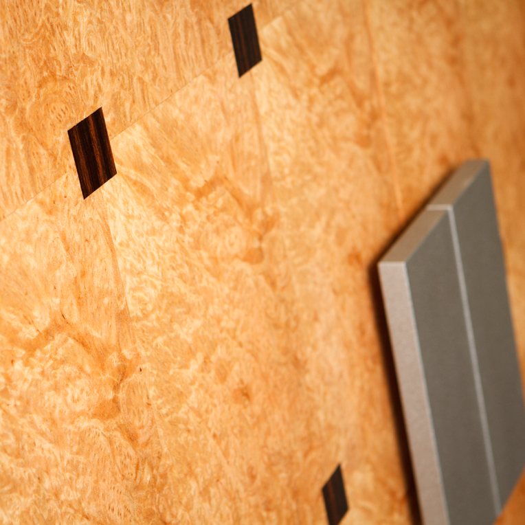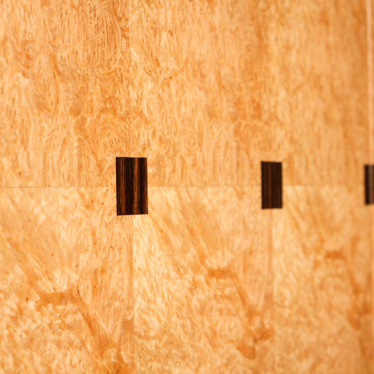 It’s something you’ll notice features often in my work. Here we have the repetition of 60 slip matched Eucalypt Burl veneer panels, combined with 90 inlaid Macassar Ebony squares.