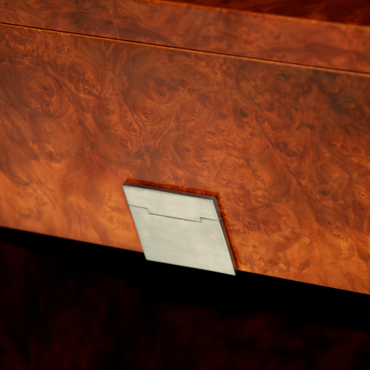 Burl Myrtle, with satin Chrome Flap Handles.