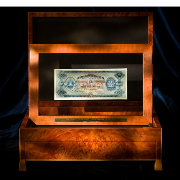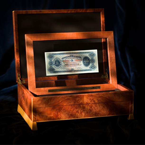 Anton Gerner was commissioned by Coinworks to design and craft a special presentation Box for the first banknote of the Commonwealth of Australia, Serial Number M000001, issued 1 May 1913.