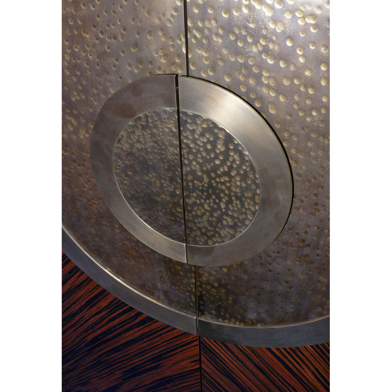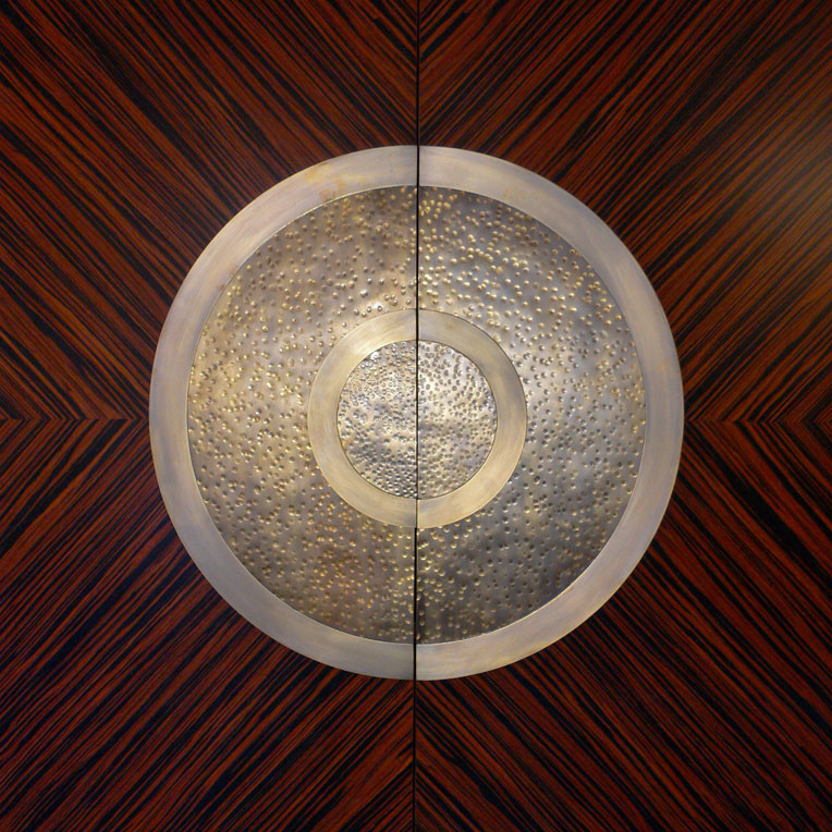 The main feature of this cabinet is the hand made handle in beaten Bronze. The diagonal lines in the veneer draw the eye to this centrepiece.
