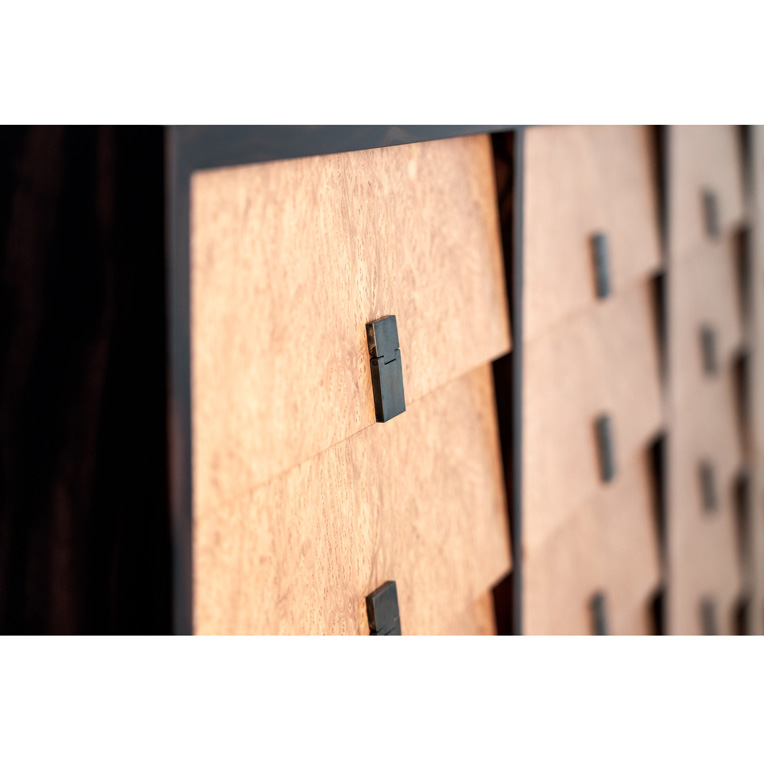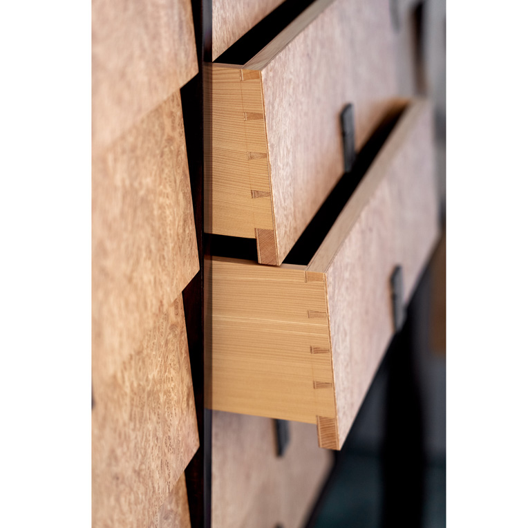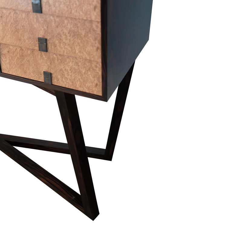 Macassar Ebony, Eucalypt Burl, Celery Top Pine, handmade brass handles.