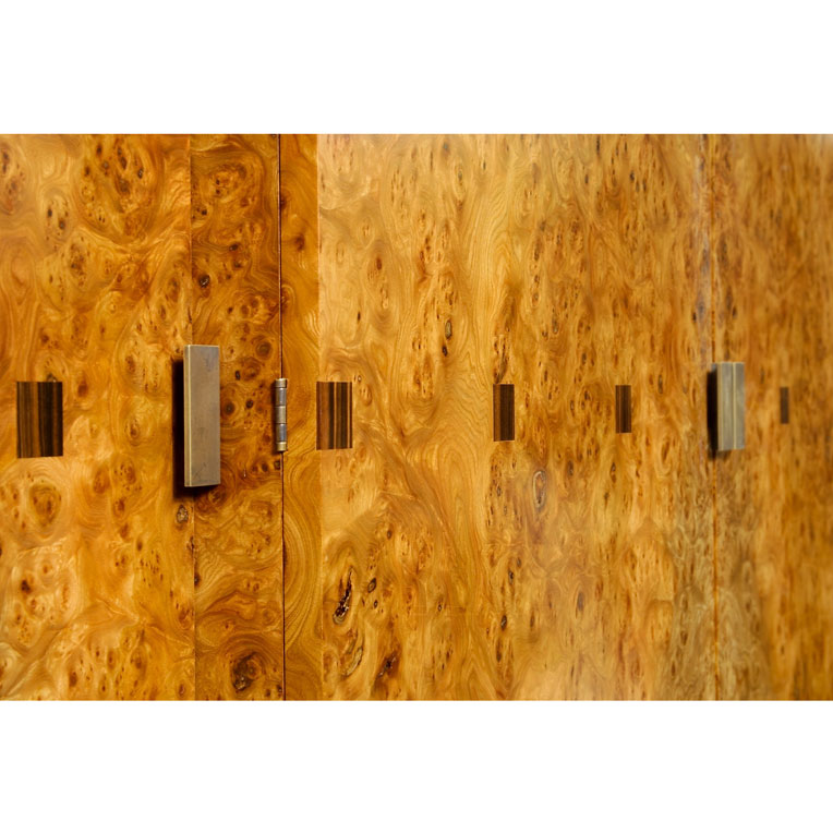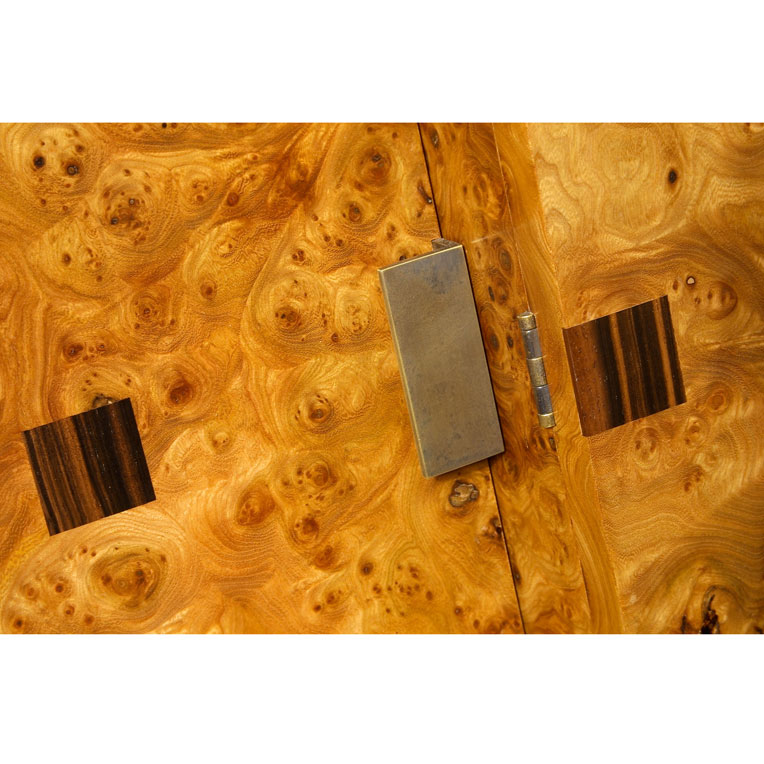 Burr Elm, with Macassar Ebony inlay details and Bronze handles.