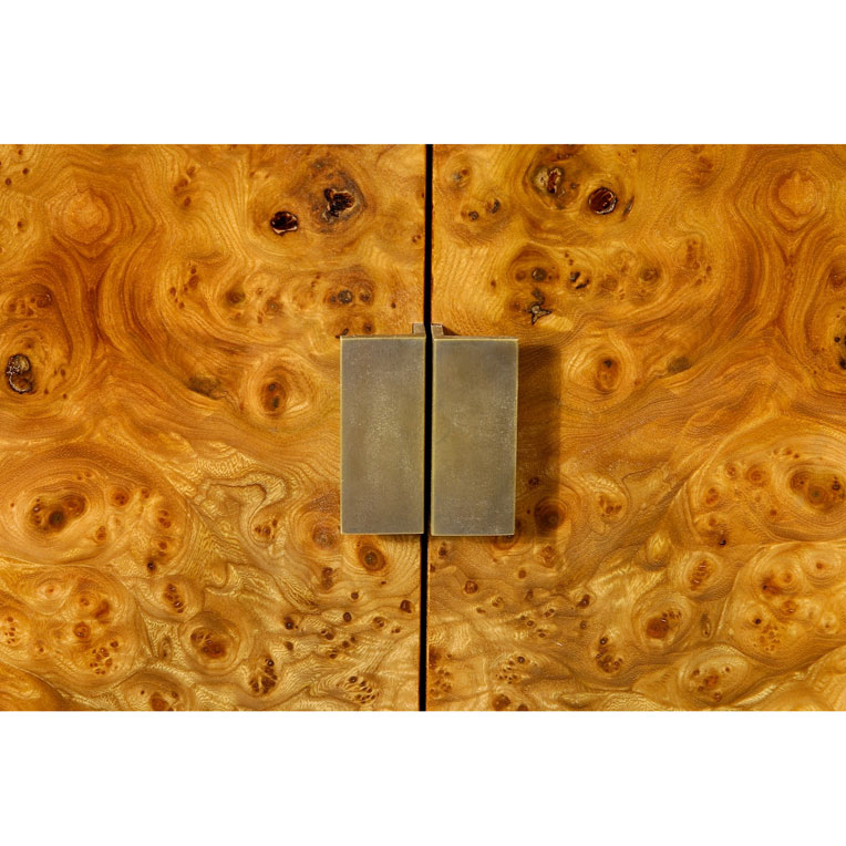 Book matched Burr Elm veneer. Originally designed as a storage unit, this cabinet can also be made to hold a TV.