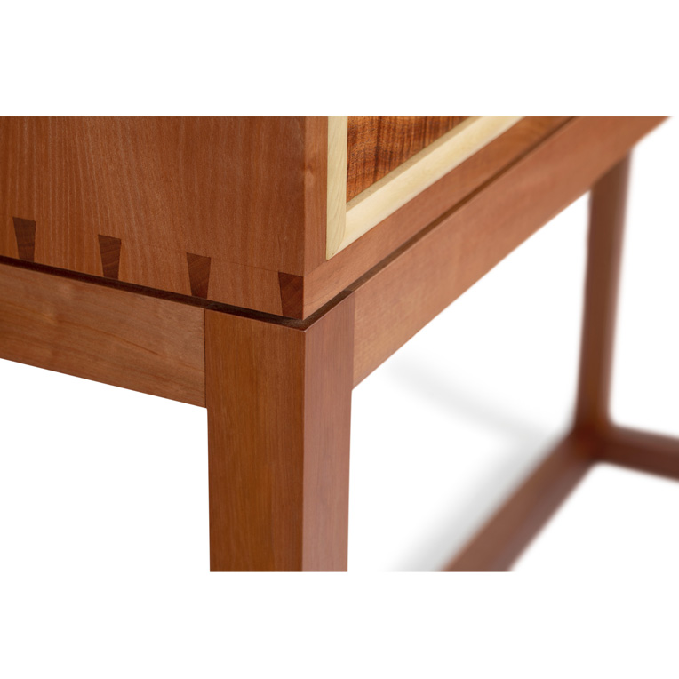 “This was the piece that first gave me the idea for The Anton Gerner Exhibition. Working without drawings (like all of the pieces in this exhibition) I started on this cabinet one Saturday in 2011. I sliced up some very special Fiddleback Blackwood and decided to contrast this with Huon Pine for the drawer fronts and doors.