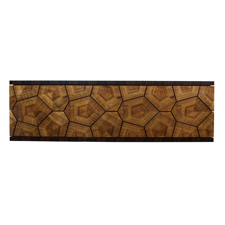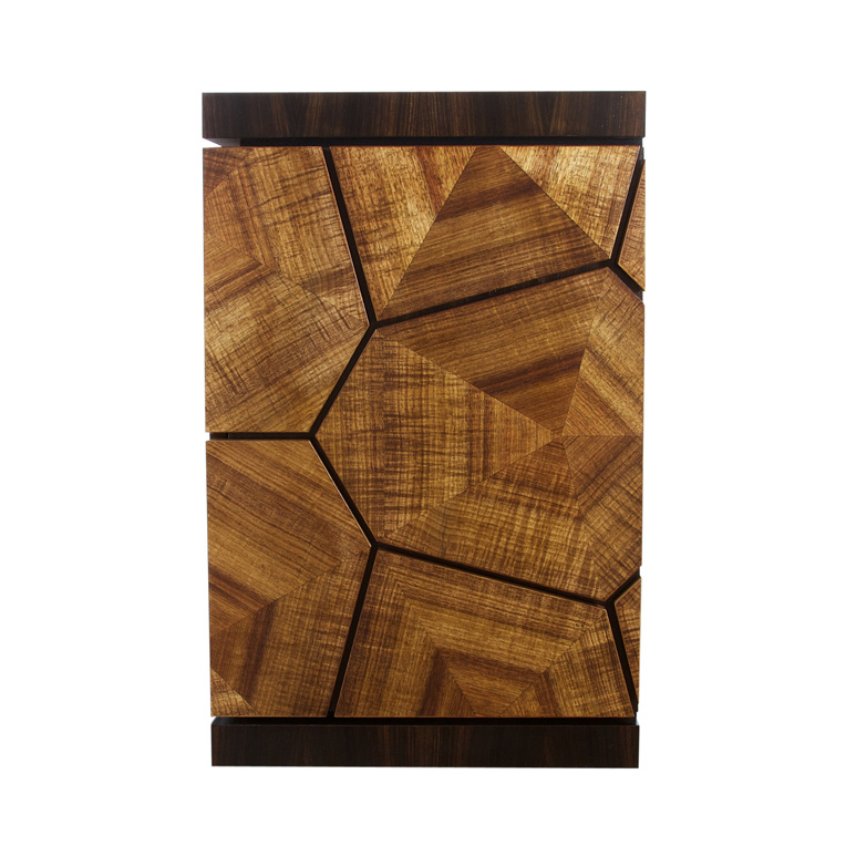 This feature cabinet is made from stunning Tasmanian Fiddleback Blackwood, which is cut into a segmented geometric pattern and is contrasted by black Macassar Ebony. The inspiration for this design came to Anton Gerner when he saw a tortoise shell at the Tokyo Aquarium. Many of the geometric shapes have push to open drawers behind them.