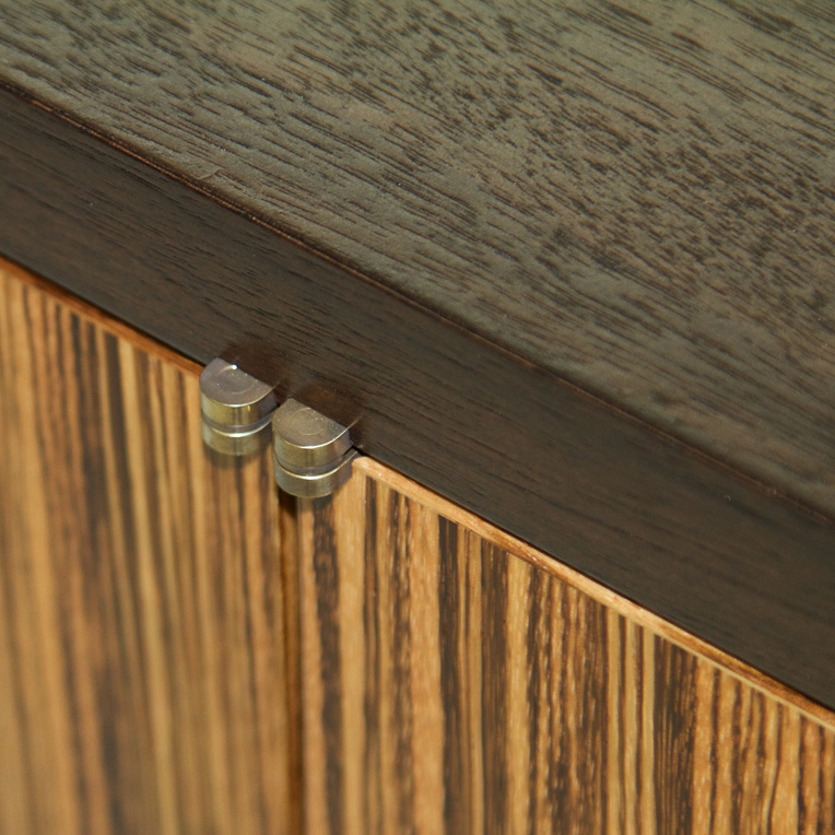 A feature cabinet made from rich dark stained Walnut, with contrasting feature Zebrano doors. The interior features push to open drawers and adjustable shelving. The aged bronze handles are hand made by Anton Gerner.
