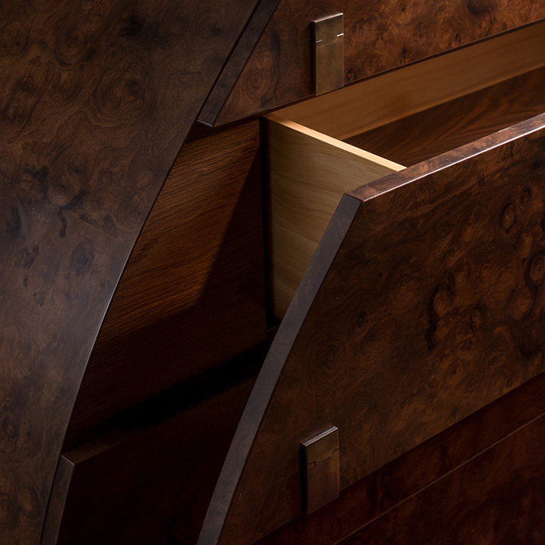 Historically, Burr Walnut was reserved for classic Victorian chests—elegant, rectangular, and restrained. But, in true Anton style, he wanted to challenge convention and question why a chest of drawers must conform to such a rigid shape. The rich, swirling grain of the Burr Walnut enhances the piece’s organic, fluid nature.